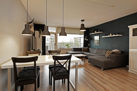 Vanuit de hal kom je in de lichte en ruime woonkamer, welke een oppervlakte heeft van circa 31m² en veel lichttoetreding door de kamer met hoge raampartijen. Verder biedt de woonkamer, middels twee aparte deuren, toegang tot het ruime balkon, welke op het Noordwesten is gesitueerd met tot in de avond de zon.